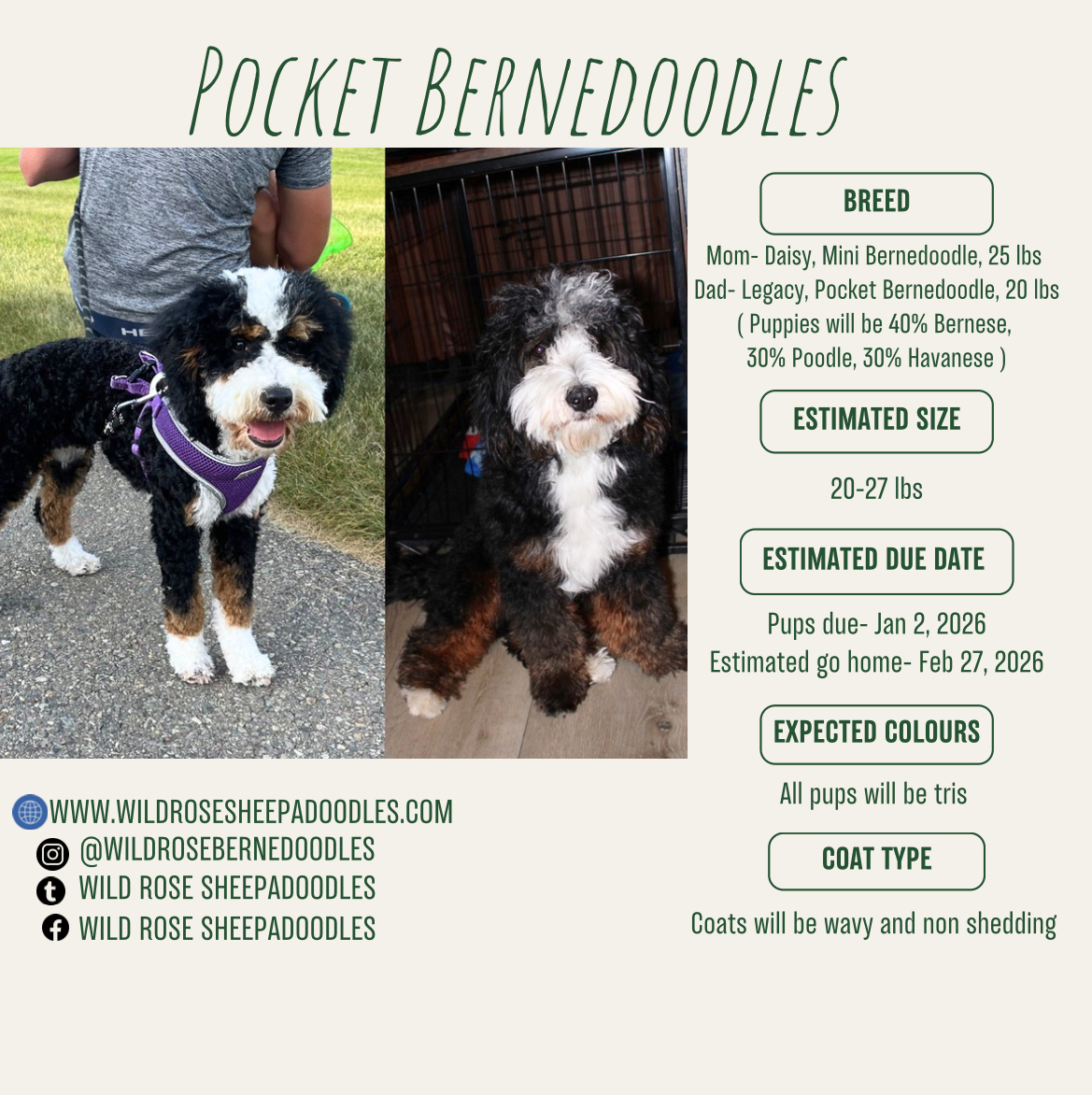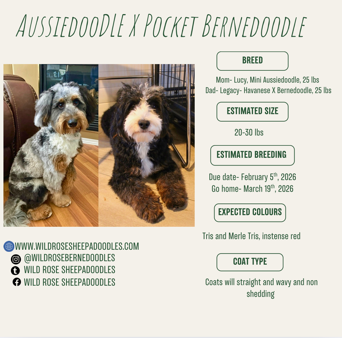 Thank you for checking out our site and for your interest in a Sheepadoodle or Bernedoodle from Wild Rose Sheepadoodles. With the excellent temperament, size and health of all our dogs, we promise you’ll fall madly in love with your new Wild Rose puppy and will never regret adding one of our babies into your family.