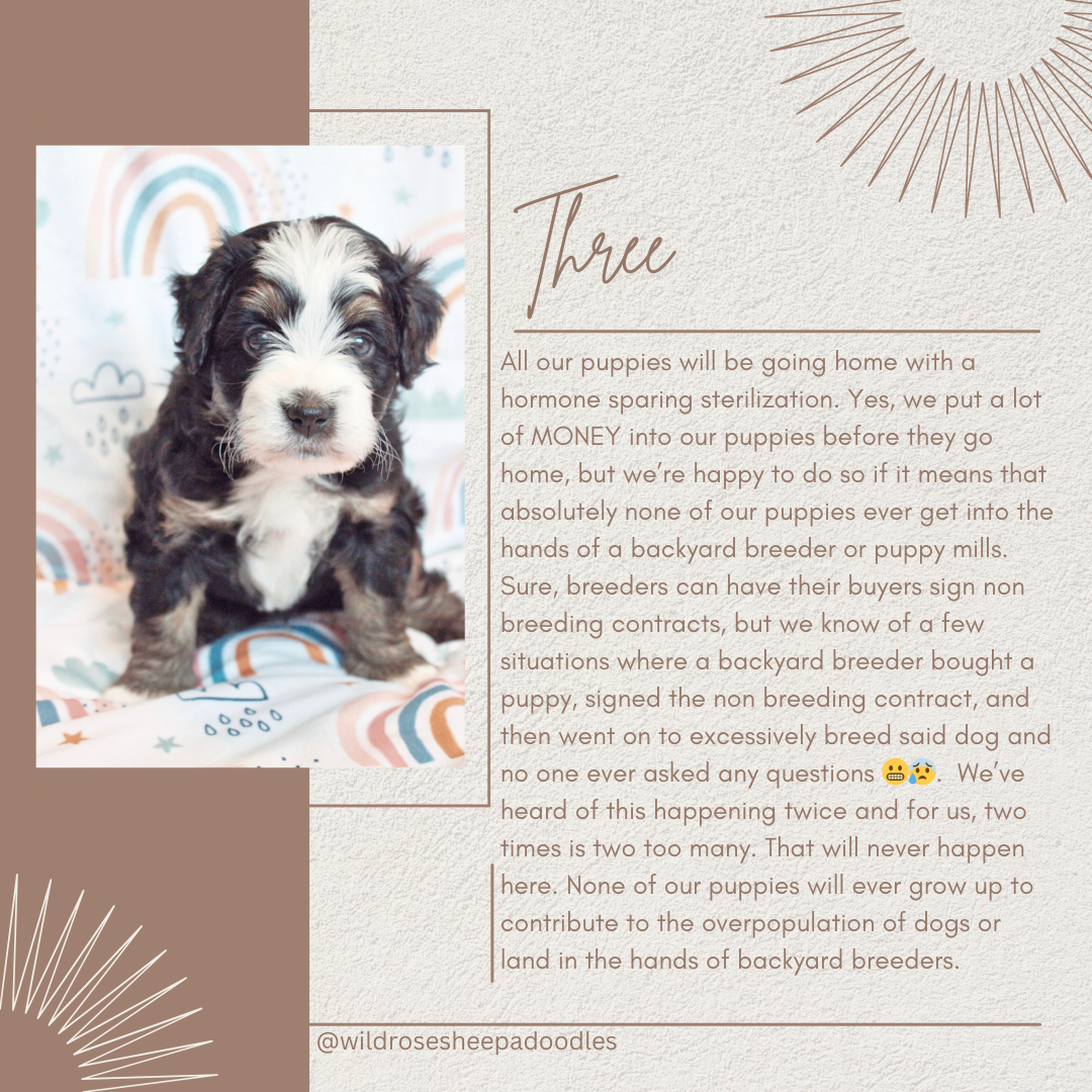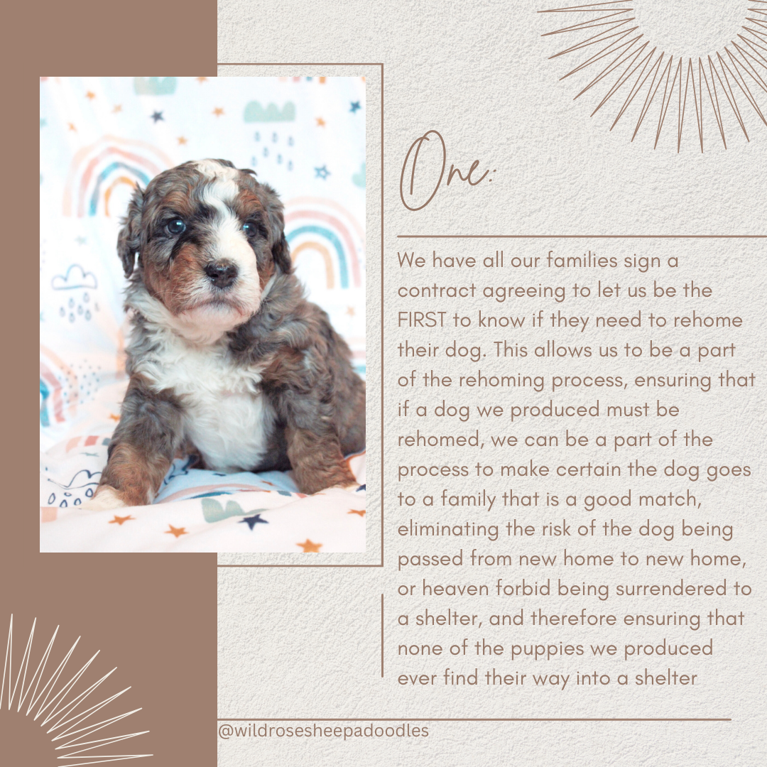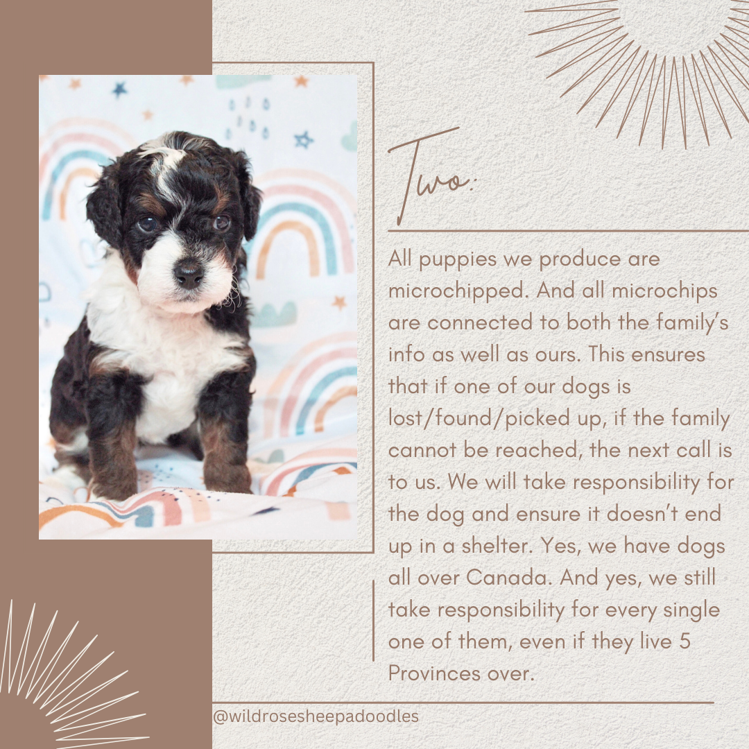 Once you are approved, we ask for a $300 non refundable deposit to be placed on the waitlist of your choosing. You can etransfer the deposit to our email wildrosesheepadoodles@gmail.com. We will put your name under the breeding/litter that you are interested in. The deposit is non refundable however does go towards the final price of your puppy. Your deposit will go under the litter you are interested in, however we understand that life happens and therefore your deposit can be transferred to a different litter up to two times.