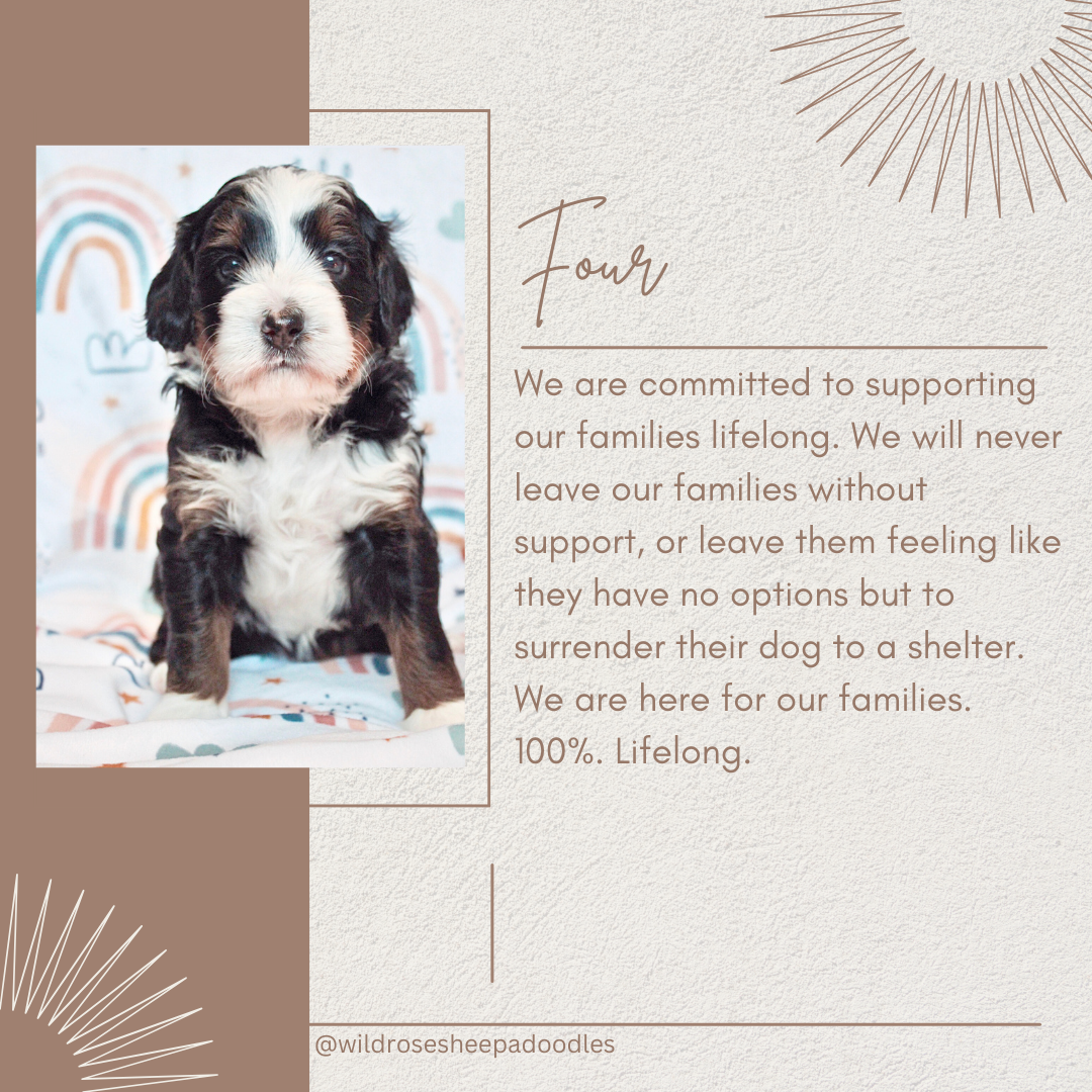 We are ALWAYS here to support you, available via email, texting or phone calls. However in addition to this, we want our families to go home feeling confident with their new puppy and in their abilities to tackle the puppy stage and raise their new puppy into the dog of their dreams. We are constantly trying to improve our program and improve your experience in getting your new puppy from us! We LOVE our puppies, but we also LOVE our Wild Rose families! Because of this, we want no puppy family to leave here without feeling supported in creating a great start to training their puppy. Therefore, each of our Wild Rose Families will receive a complimentary four week puppy training program, paid for by us! This program is an online, day by day, step by step guide to all things puppy training, and will give you and your puppy the education and confidence you need for the best start possible to raise your puppy up into a calm and well behaved doggo!